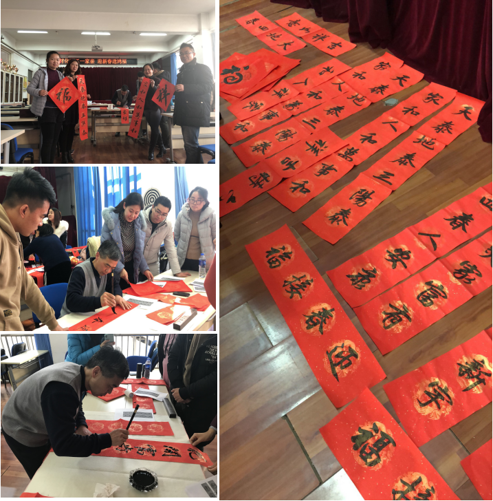 自上午9点至下午4点钟,活动共持续了7个小时,期间活动室人头攒动,热闹非凡,洋溢着喜庆祥和了节日气氛。据统计仅樊平老师一人就撰写了120余副对联,获得了广大师生的赞许。本次活动不仅寄托了教工们对挥别狗年、喜迎猪年、辞旧迎新的美好愿景,而且唱响了全院上下平安吉祥、和谐发展的励志高歌。