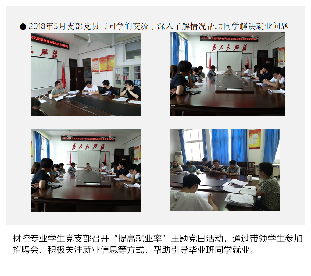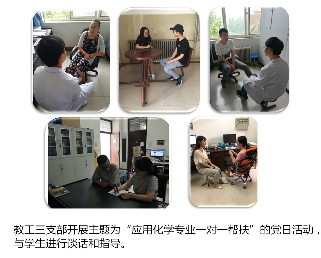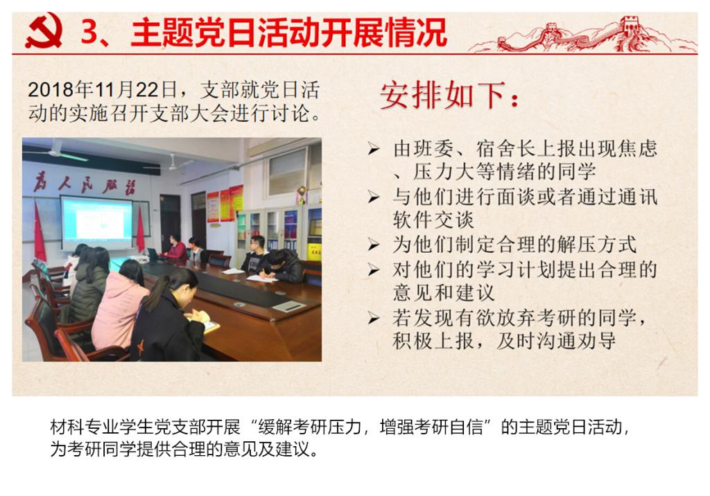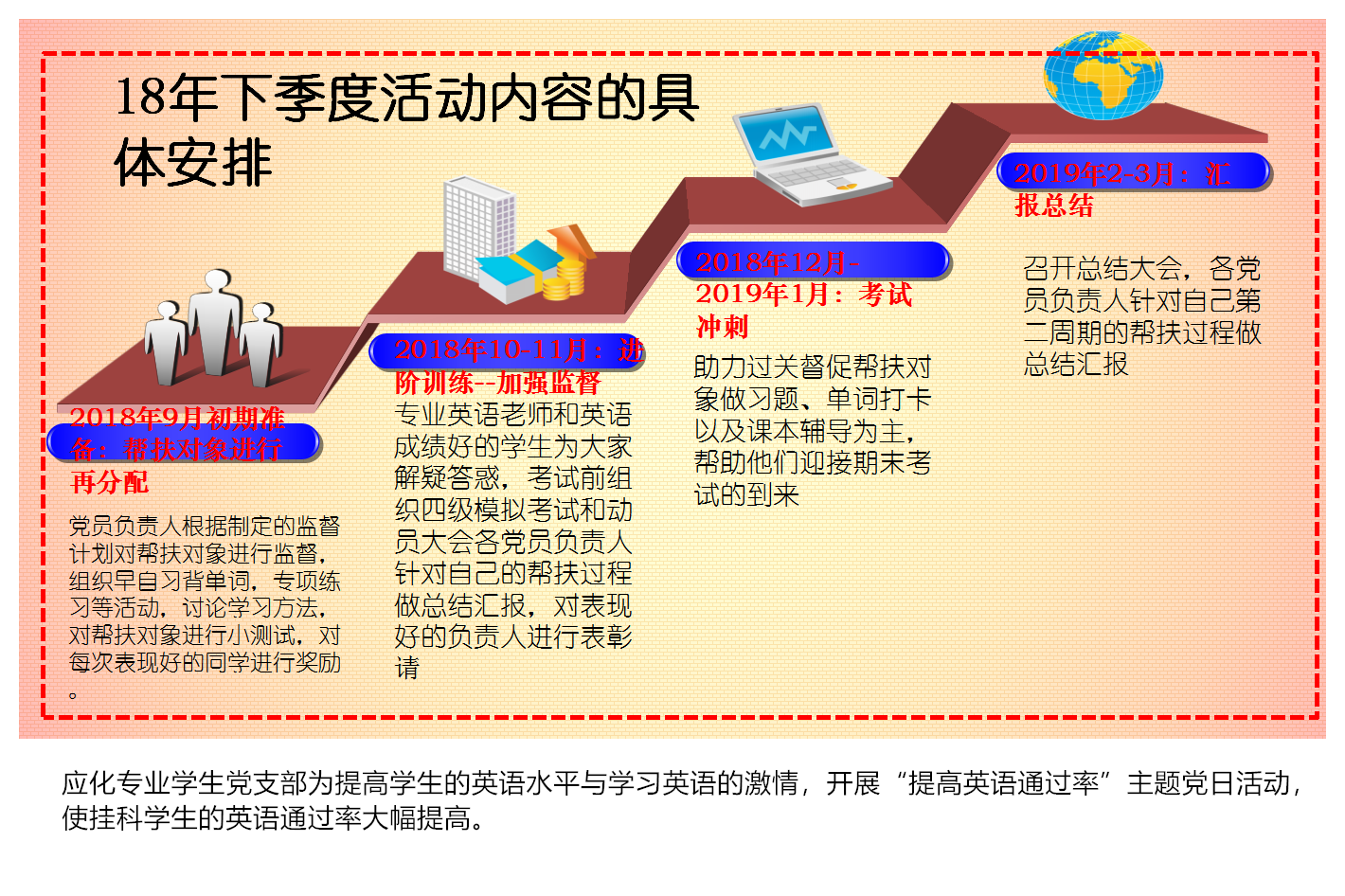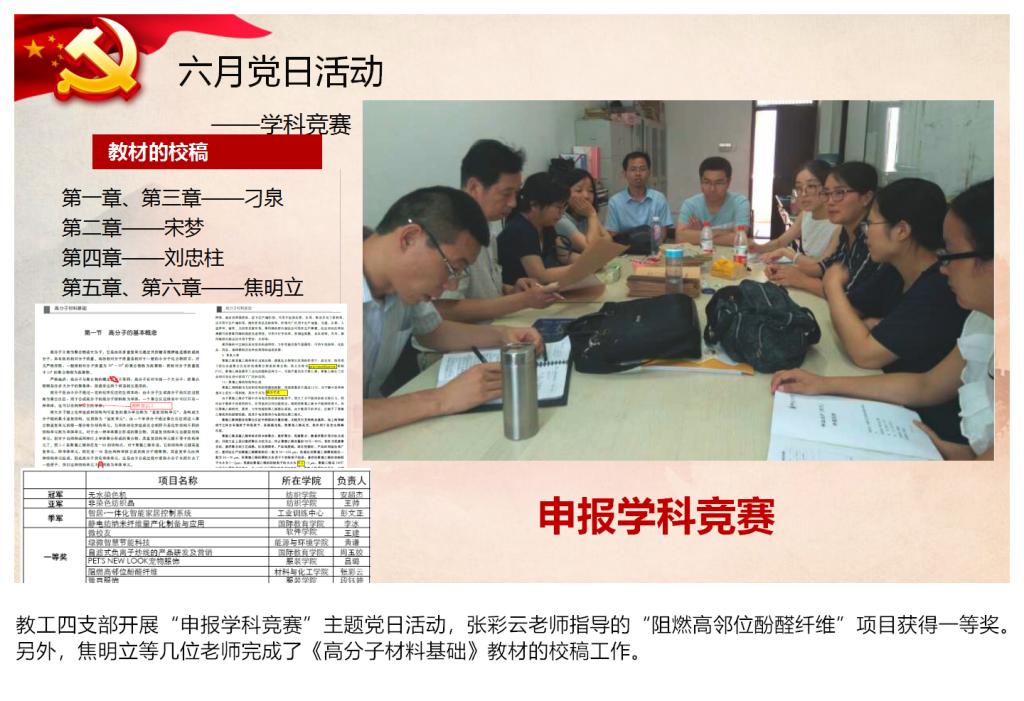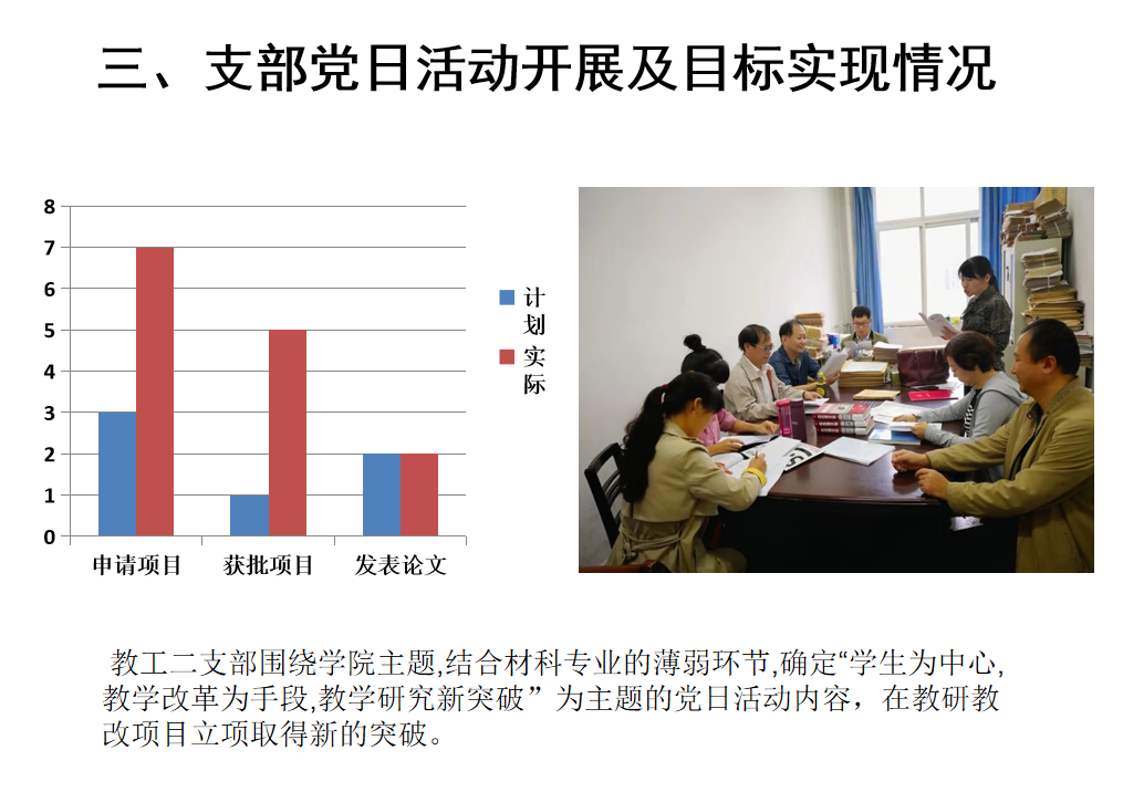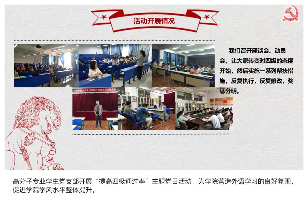教工一支部支部发挥专业优势制定了签订校企合作协议的目标,目前已签订协议11项,完成横向经费入账150万余元,超额完成了目标;教工四支部针对教学教研薄弱的情况,积极寻找突破口,计划撰写并出版教材1本、教研项目申请书2项、发表教改论文2篇,目前均超额完成任务,除此之外,焦明立、刁泉老师指导的创新团队获得2018年河南省“互联网+”老员工创新创业大赛一等奖并获得国赛铜奖,“高分子材料与工程”获批2018年伟德体育官网“专业综合改革试点”立项建设;以“以应用化学专业思政项目组”为载体,成立了教工七支部,创新了基层党组织建设,探索了“知识传授与价值引领同频共振”的有效路径。高分子专业员工党支部开展以“提高四级通过率”为主题的党日活动,通过对16级各班英语四级通过情况统计分析确定帮扶对象,帮扶前该班四级通过率为16.7%,帮扶后通过率达到40%,提升了一半以上。材科专业员工党支部开展以提高考研率为主题的党日活动,目标是研究生考取率达到30%,目前材科15级员工有74%参加了考研,过线率已经达到46.15%;研究生党支部针对员工科研成果少且质量不高的实际情况,制定了提升科研成果的活动计划,完成了25项学术成果,其中一区文章1篇,三区文章3篇,四区文章1篇,EI论文1篇,中文期刊4篇,专利14项,国家级竞赛奖1项。
