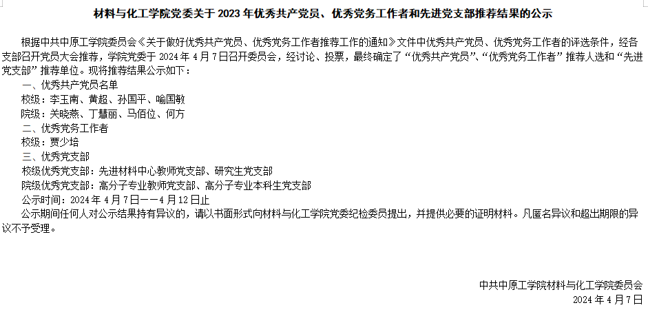 材料与化工公司党委关于2023年优秀共产党员、优秀党务工作者和先进党支部推荐结果的公示