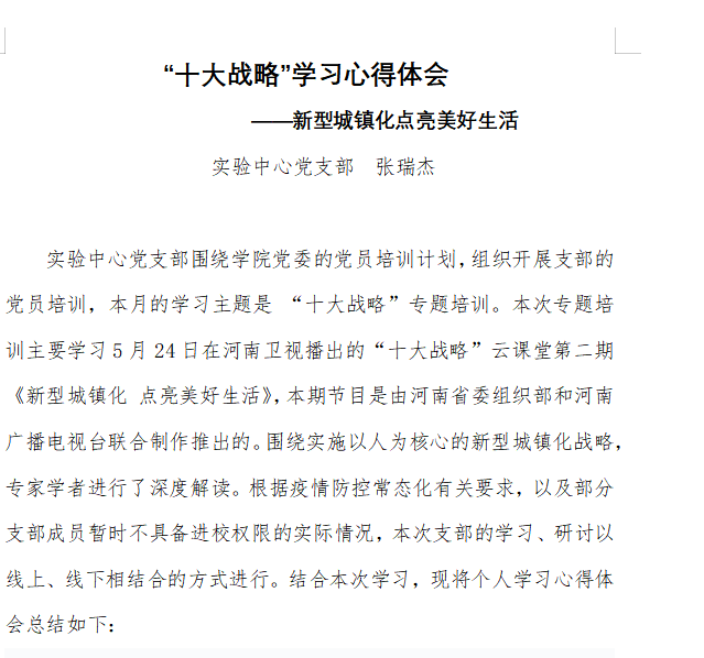 5月26日支部召开线上党员大会,为学院领导班子召开“720”以案促改民主生活,广泛征求党员、干部和群众意见建议,为院领导班子和领导干部找准问题、开好民主生活会做准备。关于学校增补两委委员候选人预备人选的文件,我支部征求、收集各位党员同志意见:本支部五位党员同志一致同意公司党委的推荐人选。5月份的主题党日活动的学习主题是 “十大战略”专题培训。本次专题培训主要学习5月24日在河南卫视播出的“十大战略”云课堂第二期《新型城镇化 点亮美好生活》,本期节目是由河南省委组织部和河南广播电视台联合制作推出的。围绕实施以人为核心的新型城镇化战略,专家学者进行了深度解读。根据疫情防控常态化有关要求,以及部分支部成员暂时不具备进校权限的实际情况,本次支部的学习、研讨以线上、线下相结合的方式进行。支部党员分别在线上观看了视频学习材料, 5月30日召开支部座谈会,交流学习心得、实践体会,会后要求每位党员撰写个人学习心得体会。